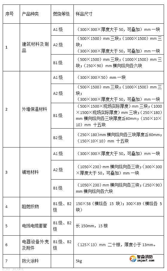 三、建筑材料燃燒性能檢測(cè)項(xiàng)目、等級(jí)及樣品尺寸: