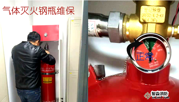 1)檢查每個(gè)滅火劑瓶組和驅(qū)動(dòng)氣體瓶組的壓力,壓力表的壓力指示值應(yīng)在綠色區(qū)域內(nèi)。