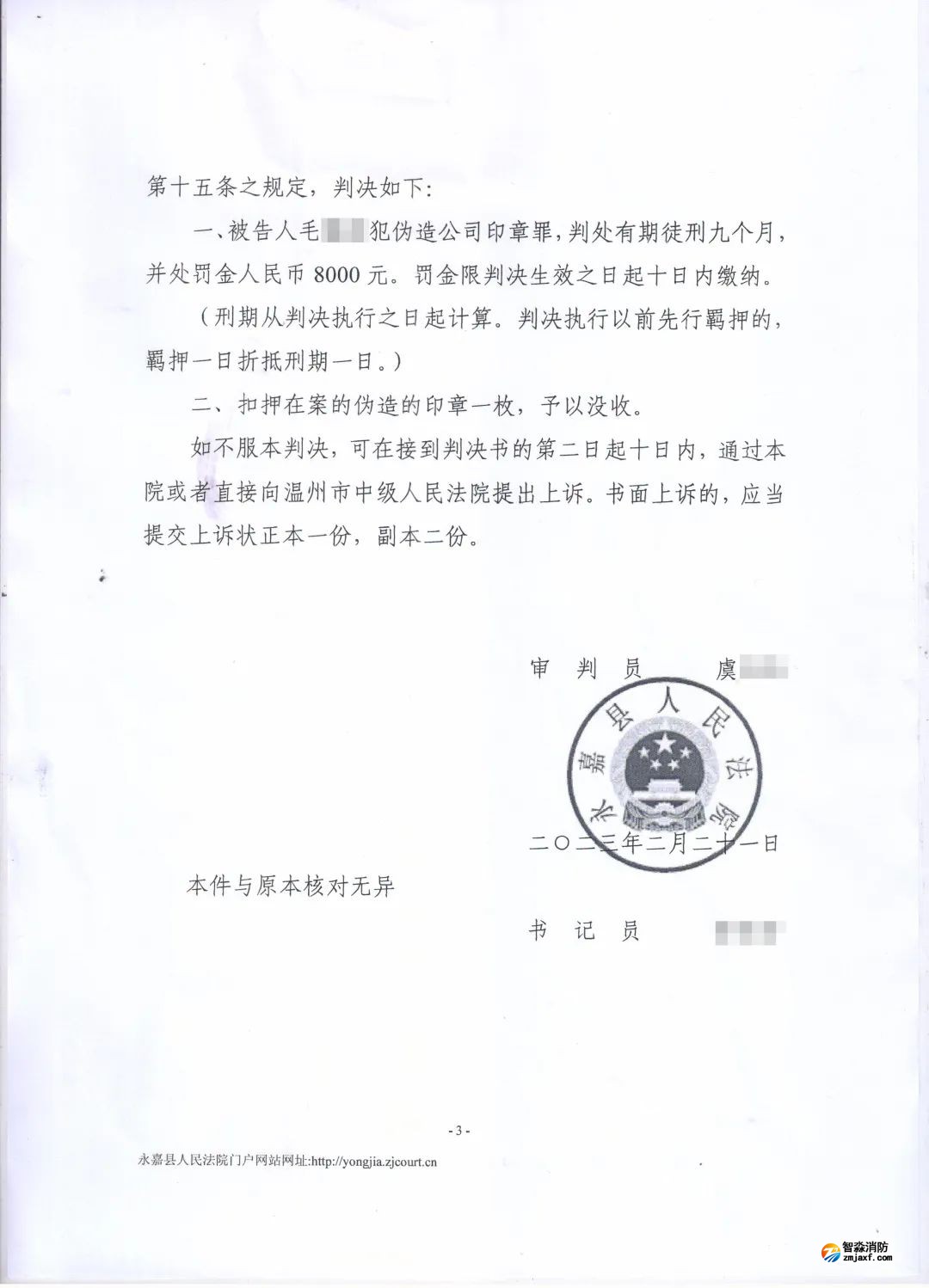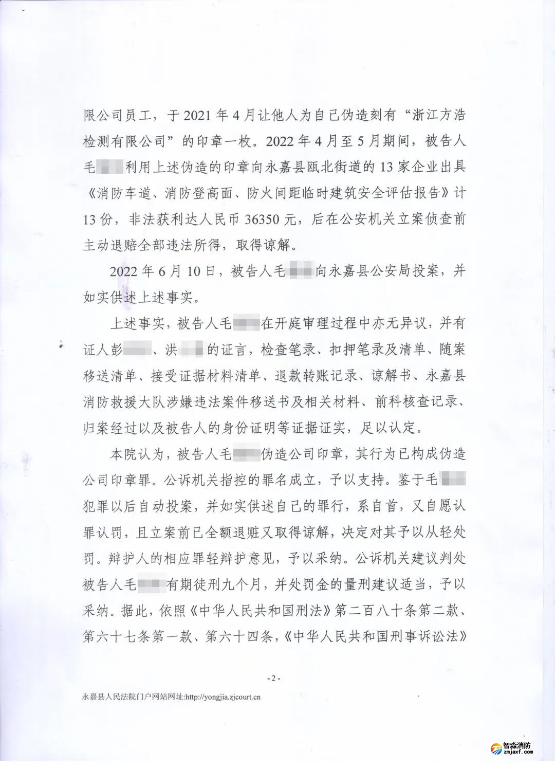 2023年2月21日永嘉縣人民法院對毛某偽造其所任職的消防技術服務機構的公司印章,出具虛假消防檢測報告一案予以判決,當事人毛謀因犯偽造公司印章罪被判處有期徒刑九個月并處罰金人民幣8000元。