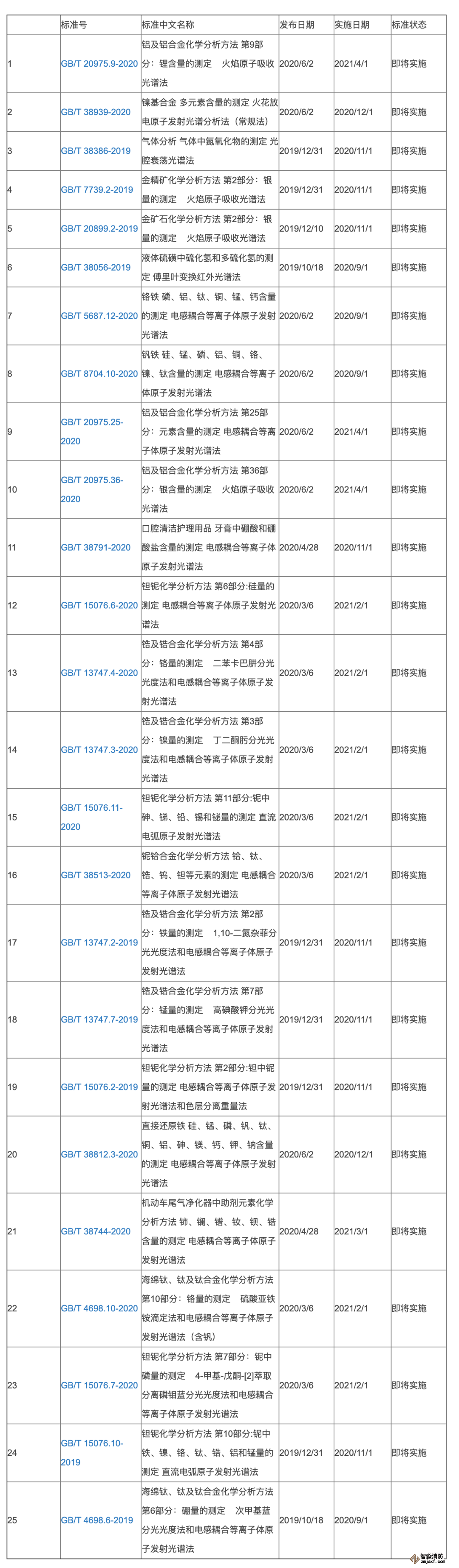 根據(jù)全國標(biāo)準(zhǔn)信息公共服務(wù)平臺以“光譜”搜索(國家標(biāo)準(zhǔn))數(shù)據(jù)分析,目前現(xiàn)行的國家標(biāo)準(zhǔn)576條,廢止的227條,即將實施的25條,涉及火焰原子吸收光譜法、火花放電原子發(fā)射光譜分析法、傅里葉變換紅外光譜法、電感耦合等離子體原子發(fā)射光譜法、直流電弧原子發(fā)射光譜法等。另外,還有一系列光譜相關(guān)的國家標(biāo)準(zhǔn)計劃正在起草、征求意見、審查,或者正在批準(zhǔn)中。