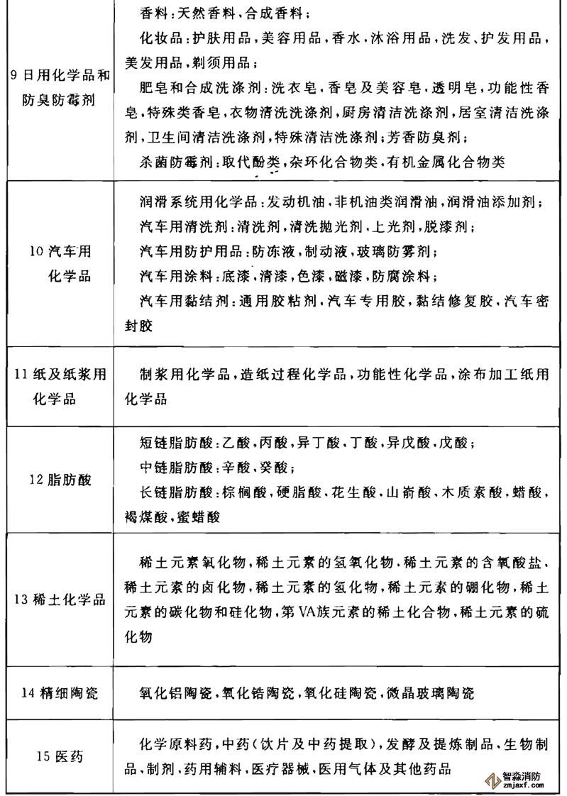 關(guān)于精細(xì)化工產(chǎn)品分類,上海市工程建設(shè)規(guī)范《精細(xì)化工企業(yè)設(shè)計(jì)防火規(guī)范》DGJ 08-2133將精細(xì)化工產(chǎn)品分為十五大類:農(nóng)藥、染料、涂料(包括油漆和油墨)、顏料、試劑和高純物、信息用化學(xué)品(包括感光材料、磁性材料等能接受電磁波的化學(xué)品)、食品和飼料添加劑、黏合劑、催化劑和各種助劑、化學(xué)藥品(原料藥)和日用化學(xué)品、高分子聚合物中的功能高分子材料(包括功能膜、偏光材料等)、微電子化學(xué)品、生物化工制品(生物技術(shù)藥物、診斷試劑、化學(xué)藥物)、太陽(yáng)能光伏光熱化學(xué)品、新材料(高性能膜材料、特種玻璃、功能陶瓷)等。