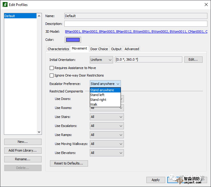舊版的Pathfinder模擬扶梯時(escalators)人員在扶梯上的狀態(tài)只能是行走(Walk),而新版本的Pathfinder增加扶梯上人員的狀態(tài)選項,人員可以在扶梯上站立(Stand)也可以行走(Walk),并且可以選擇人員在扶梯上站立的位置,包括靠左站立、靠右站立和站立在任意位置,該功能的增加無疑使疏散模擬情景更接近實際。